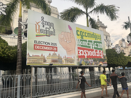 ミャンマー軍事政権が主導する総選挙の「第1段階」投票が28日行われる。写真は、26日、最大都市ヤンゴンに設置された総選挙への参加を促すポスター。 【時事通信社】