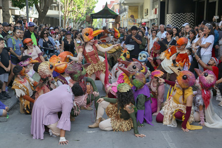 25日、中米グアテマラの首都グアテマラ市で開かれた、国際的なコメディーとサーカスの祭りの一コマ。南米コロンビアの演者が披露したパフォーマンスには、老若男女問わず多くの観客が集まり、道を埋め尽くした。 【EPA時事】