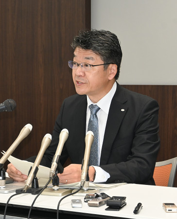 トヨタ自動車系部品大手のデンソーは28日、半導体大手ロームへの買収提案の撤回を決めたと発表した。「ロームから賛同の意見を得るには至らなかった」という。写真は撤回について説明するデンソーの林新之助社長。 【時事通信社】