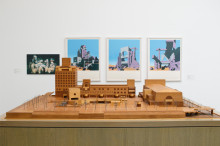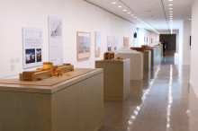 展示は同館の模型を展示する第3室を軸に、第1室から第5室までが対称になって都市計画と建築の営みを紹介。第5室と長廊下の第6室で、代表的な建築作品を紹介する。第9室には壁面に磯崎さんの水彩画と年譜を展示。中央には磯崎さんが生前にアトリエで使っていた椅子とテーブルを展示し、来場者は椅子に座って関連書籍を鑑賞することもできる。