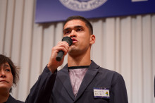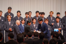 松原修平選手は代表あいさつで、「去年の結果はもう過去のこと。樹森監督の下、新しいメンバーで、新しいチームでJ1に向かって練習している。安心してほしい。皆さん、応援してくださいではなく、一緒に戦ってほしい。SNSで鹿島のシャーレの大きさの違いを見て悔しかった。一緒にあの金のシャーレをここに持ってこよう」と呼びかけると、会場から大きな拍手が送られた。
