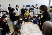 施設の模型でメッセージを残す場所を説明する有門正太郎さんと参加者