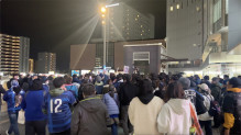 試合終了時のスタンドで喜びを分かち合う