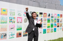 仮囲いアートの前でガッツポーズをとる平沢さん