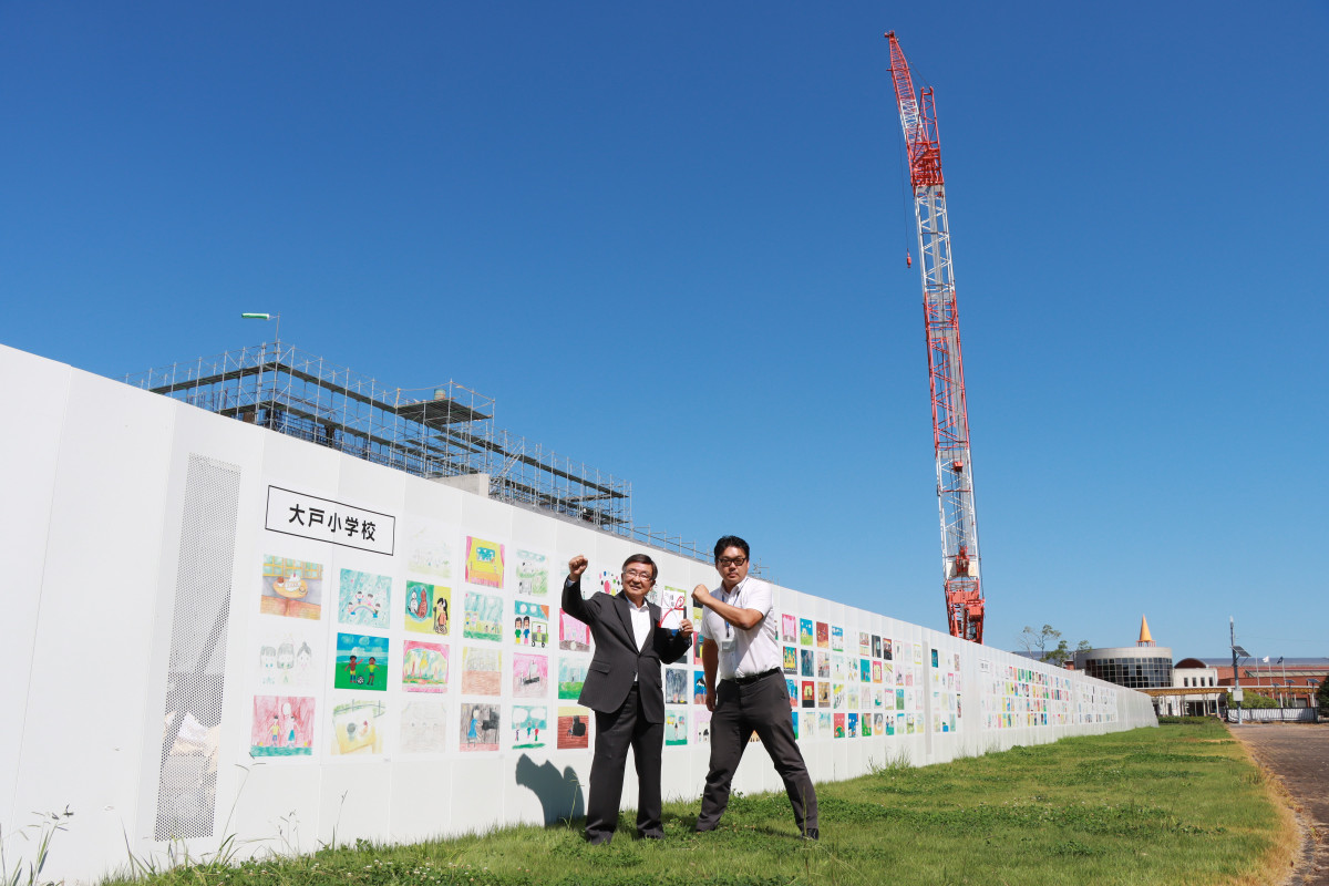 (左から)建設中の施設前の平沢さん、茨城町文化的施設整備室の海老澤靖範さん