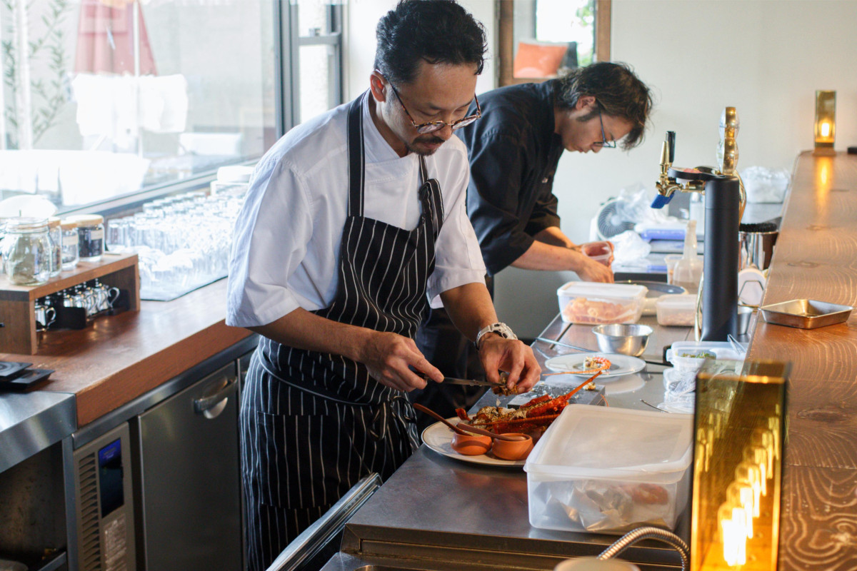 (左から)会場で料理を仕上げる「atelico」の新島さん、「L'ame(ラーム)」の加藤大恭さん
