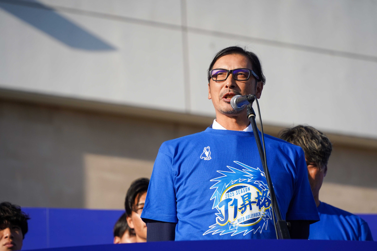 サッカーJ2水戸ホーリーホックが11月30日、水戸市立第二中学校グラウンド(水戸市三の丸)で「2025明治安田J2リーグ優勝報告会」を開いた。