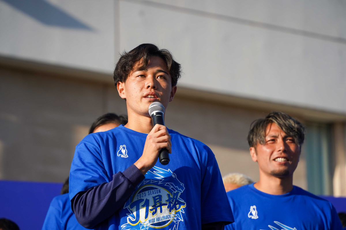 サッカーJ2水戸ホーリーホックが11月30日、水戸市立第二中学校グラウンド(水戸市三の丸)で「2025明治安田J2リーグ優勝報告会」を開いた。