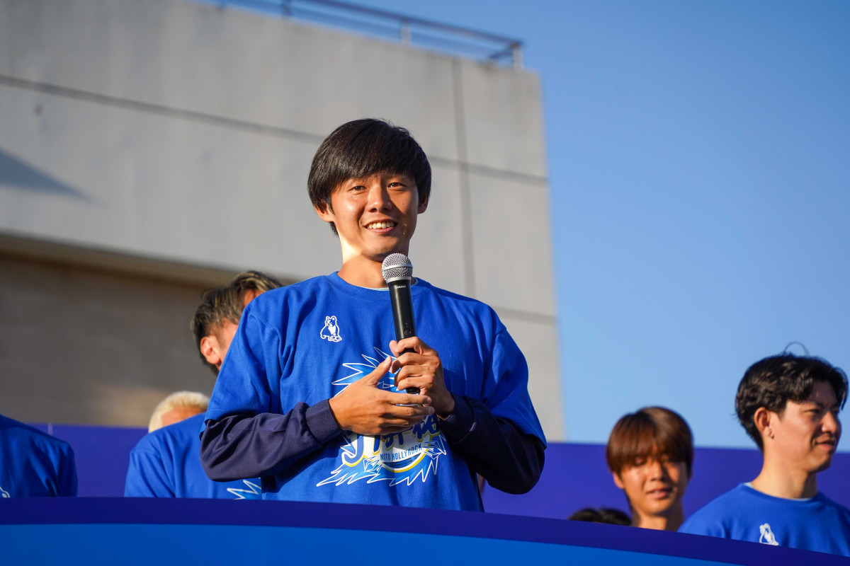 サッカーJ2水戸ホーリーホックが11月30日、水戸市立第二中学校グラウンド(水戸市三の丸)で「2025明治安田J2リーグ優勝報告会」を開いた。