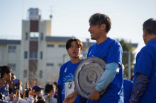 レプリカではない本物のシャーレを手に笑顔を見せる松原修平選手