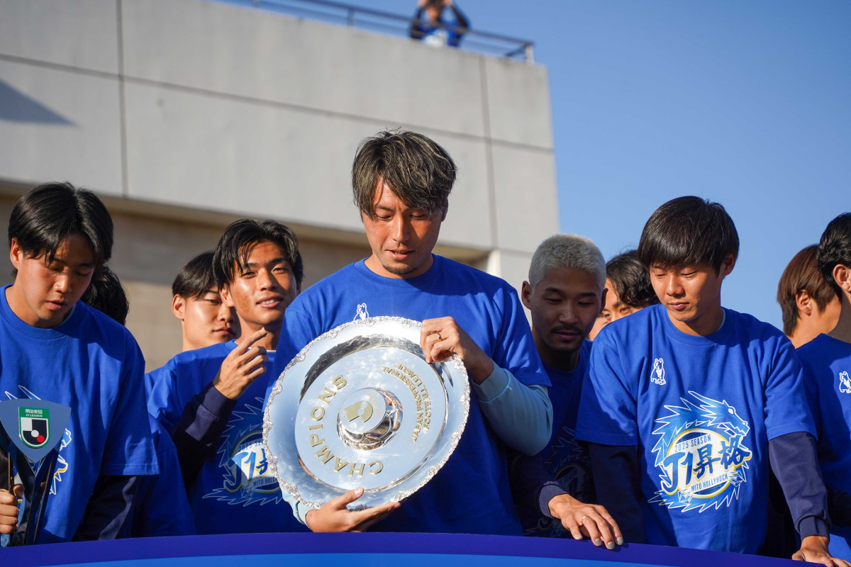 サッカーJ2水戸ホーリーホックが11月30日、水戸市立第二中学校グラウンド(水戸市三の丸)で「2025明治安田J2リーグ優勝報告会」を開いた。