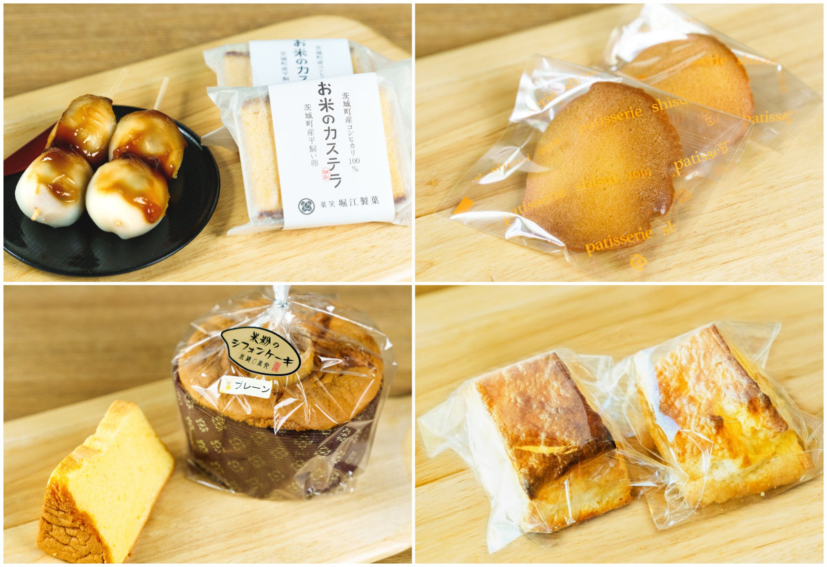 茨城町農畜産物きらり実践協議会と地元菓子店が開発した町内産米粉を使った菓子。(左上)「菓笑 堀江製菓」、(右上)「パティスリー志粋」、(左下)「米蔵高安」、(右下)「納屋cafe」の商品