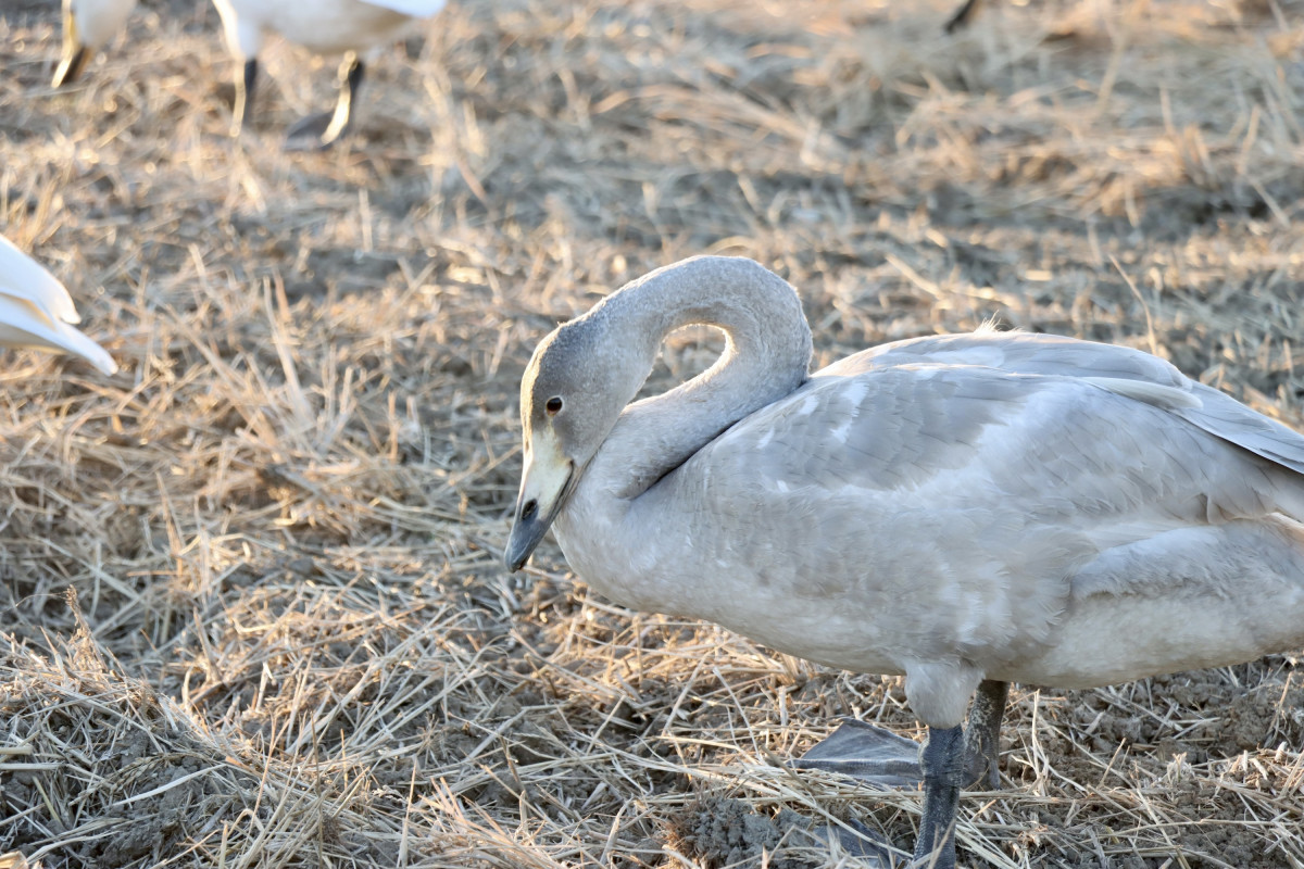 オオハクチョウの群れが現在、茨城町小堤地区と駒場地区の水田に飛来し「落ち穂拾い」を行っている。