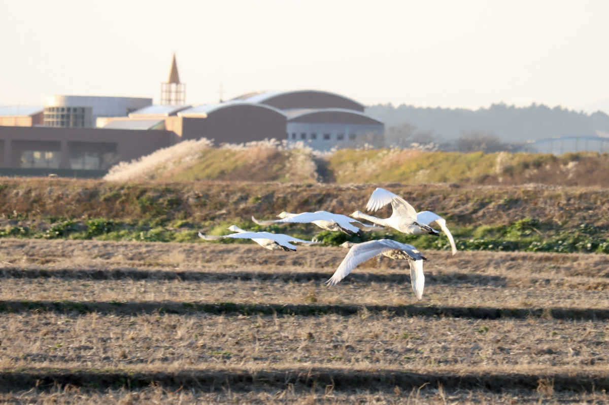 オオハクチョウの群れが現在、茨城町小堤地区と駒場地区の水田に飛来し「落ち穂拾い」を行っている。