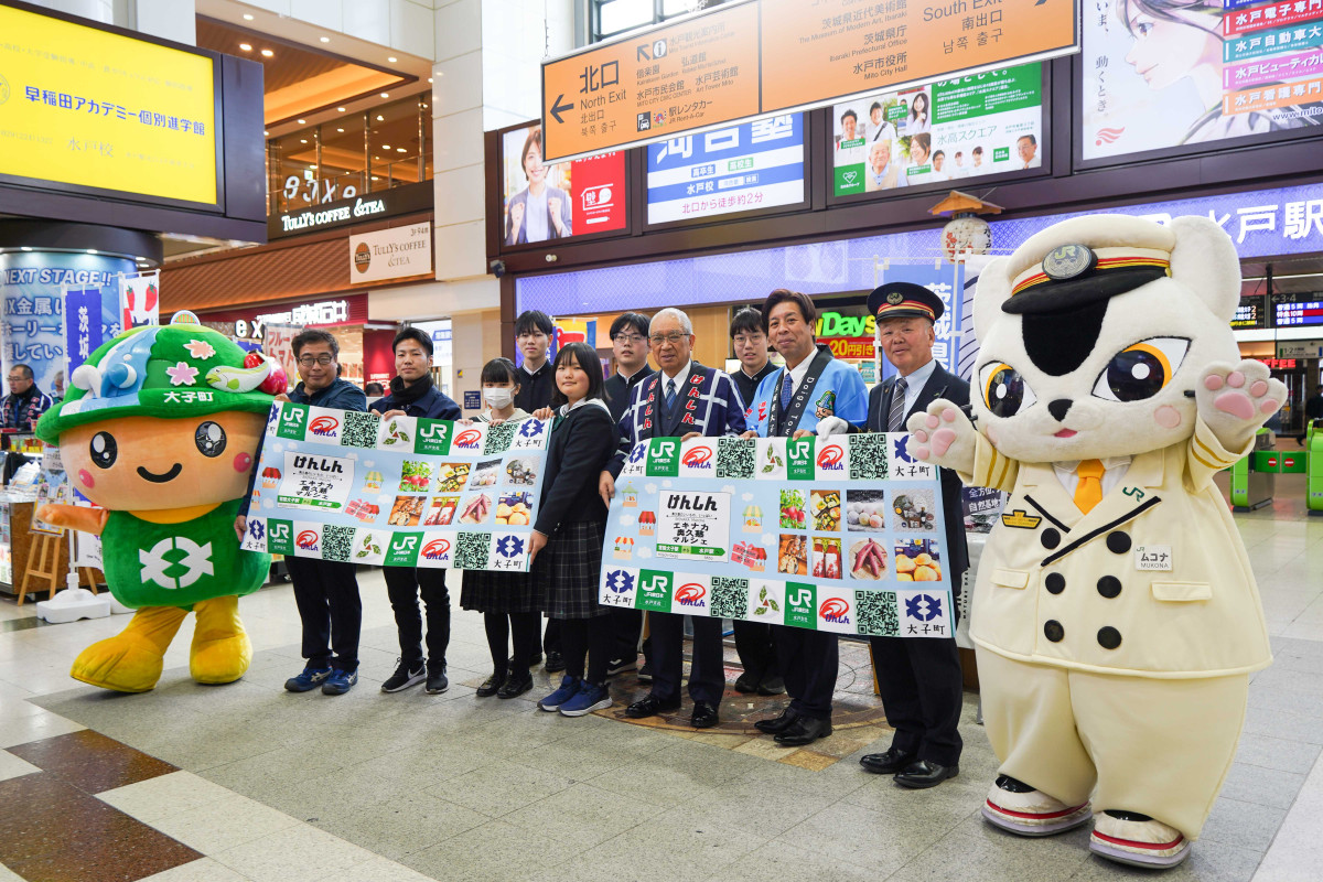 オープニングセレモニーに出席した菓匠宮川の長山福助さん、常陸太陽の庭の茅根太造さん、茨城県信用組合の渡邉武理事長大子町の高梨哲彦町長、JR東日本水戸統括センター所長(水戸駅長)の小森修さんら関係者