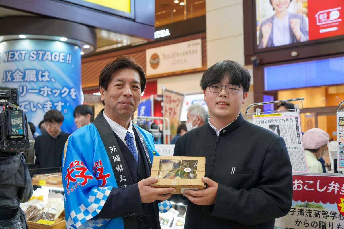高梨大子町長と弁当をアピールする大子清流高校の男子生徒