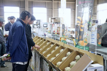 茨城町城之内集荷場内で初出荷のオトメメロンを眺め談笑する関係者