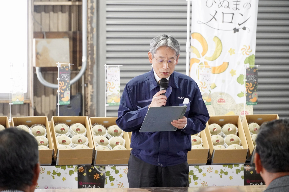 JA水戸茨城町メロン部会が3月25日、城之内集荷所(茨城町城之内)で今季初となる青肉の「オトメメロン」を出荷した。