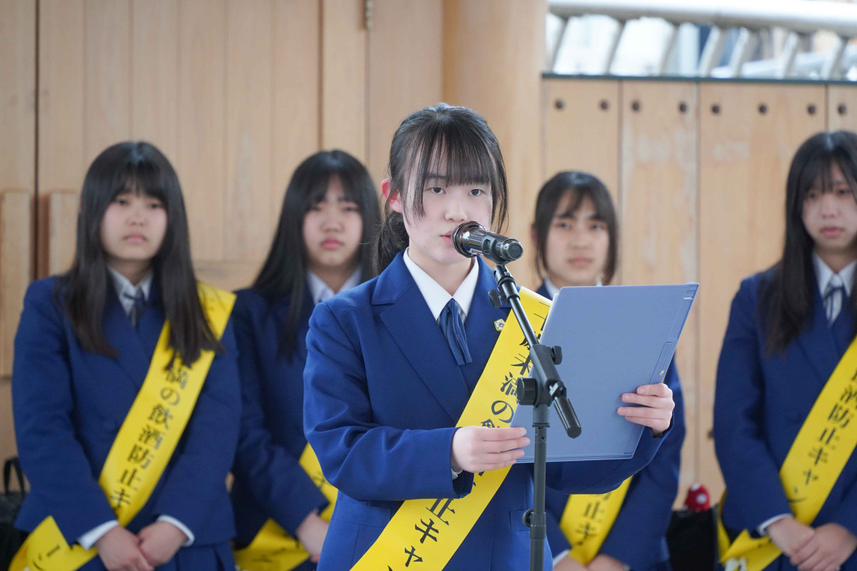 飲酒防止宣言を読み上げる水戸商業高校生徒会長の井出梨乃夏さん