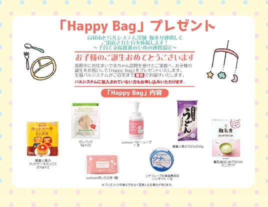 「子育て支援の推進に係る連携に関する合意書」に基づき高萩市は、助産師や保健師による乳児世帯への「赤ちゃん訪問」時に、出生祝いとして育児用品を詰め合わせた「Happy Bag」の案内カードを配付します。出生祝いは、パルシステムが宅配サービスで届けるベビーソープやおしりふき、離乳食づくりに役立つうどんやツナフレークなどの食材を詰め合わせます。