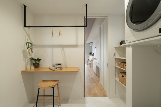 脱衣所には棚を設け、洗濯・乾燥後の作業もここで完結。ドアの先にはキッチンがあり、家事ラク動線となっています。