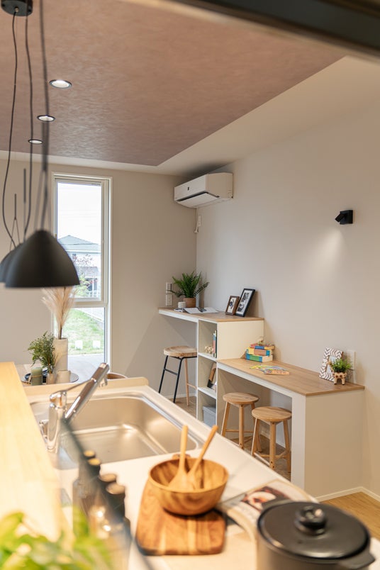 ワークスペースは、段違いのカウンターとなっているため、親子で並んでの勉強や、リモートワークも可。