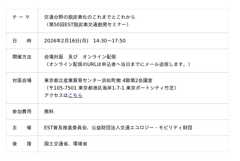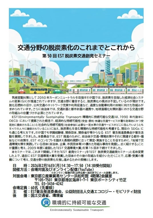 EST普及推進委員会(委員長:加藤 博和/名古屋大学教授)及び公益財団法人交通エコロジー・モビリティ財団(東京都文京区、会長:田端 浩、略称:エコモ財団)は、「交通分野の脱炭素化のこれまでとこれから」をテーマにした「第50回EST脱炭素交通創発セミナー」をハイブリッド開催する運びとなりました。記念すべき50回目となる本セミナーでは、過去の「EST交通環境大賞」受賞団体のその後の取組みを振り返り、環境的に持続可能な交通(EST)と交通分野における脱炭素化の社会実装推進に向けた新たな一歩を進める契機を提供いたします。