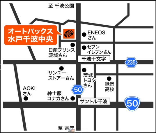 店舗は千波公園から南に約2Km、県道50号沿いに位置します。タイヤ、オイル、バッテリーをはじめとしたカー用品に加え、車検・整備などのサービスを展開いたします。自動車整備に関する知識と技術、提案力を備え、安心してクルマのメンテナンスをお任せいただける店舗として地域のお客様を全力でサポートいたします。