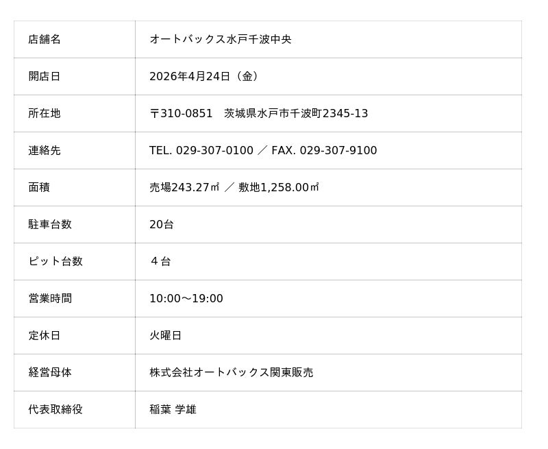 株式会社オートバックスセブン(代表取締役 社長:堀井 勇吾)と加盟店契約を結んでいる株式会社オートバックス関東販売(代表取締役:稲葉 学雄)は、2026年4月24日(金)に「オートバックス水戸千波中央(みとせんばちゅうおう)」を新規オープンいたします。