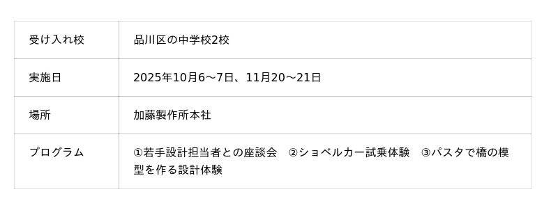 株式会社加藤製作所(代表取締役社長:加藤 公康、以下、当社)は、本社所在地である東京都品川区の中学校2校から第8学年(中学2年生)数名を対象に職場体験を実施いたします。