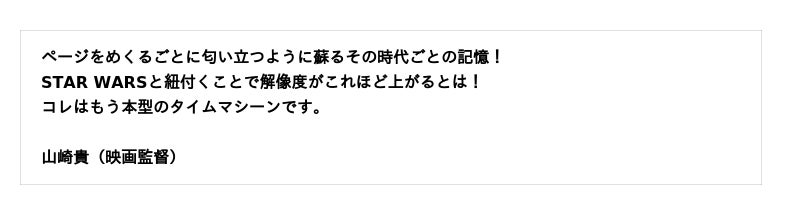 本書は、『スター・ウォーズ』が誕生する前、ジョージ・ルーカス監督が大の車好き少年だったころから、その時代の映画、政治、社会情勢、カルチャーなどとともに "『スター・ウォーズ』がどうあったか"を振り返ります。