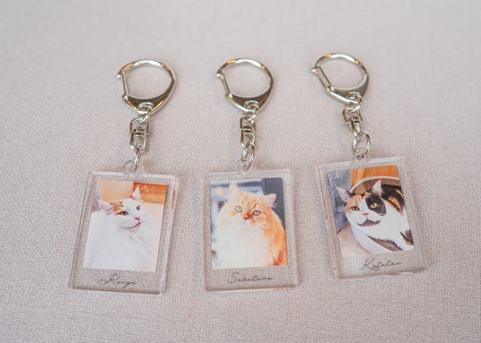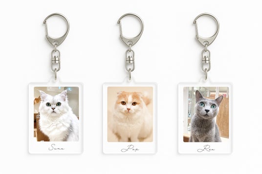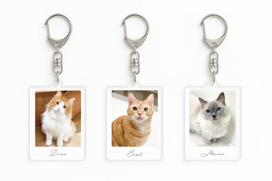 【2. チェキ風アクリルキーホルダー】各店舗の1位~3位ネコがチェキ風デザインのアクリルキーホルダーに!チェキのときめきとキーホルダーの手軽さを融合した、”推しを持ち歩く”ためのスペシャルアイテムです。店舗ごとに異なるネコのデザインを楽しめるので、訪れるお店によってラインナップもさまざま。
