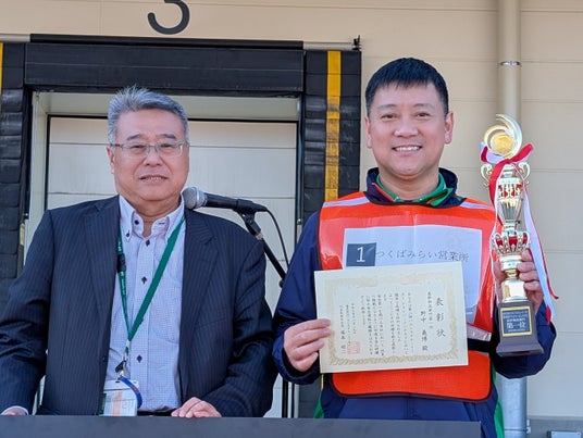 競技の結果、生活物流部門が松戸営業所の軣木(とどろき)郁弥さん、基幹物流部門は野中義博さんがそれぞれ優勝となる社長賞を獲得しました。表彰状とトロフィー、副賞の目録を手にした軣木さんは「ただうれしいのひと言です」、野中さんは「職場の皆さんが指導してくれた賜物です。これからも無事故無違反を心がけます」と語りました。