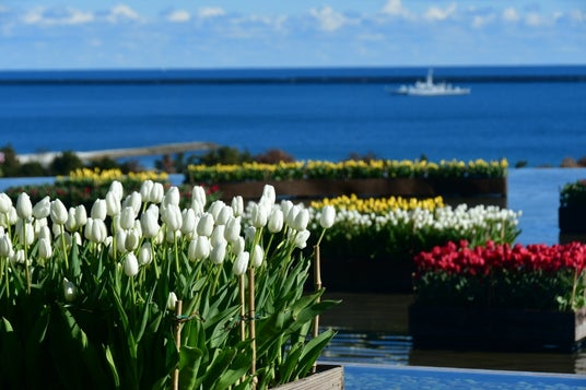 冬の園内を彩る“アイスチューリップ”を園内の2か所で展示しています。「グラスハウス」では太平洋を望む暖かい室内から、花が水面に鏡面反射した幻想的な花風景、「記念の森レストハウス」では木漏れ日差し込むカフェの周辺に広がる、メルヘンチックな花風景をお楽しみいただけます。