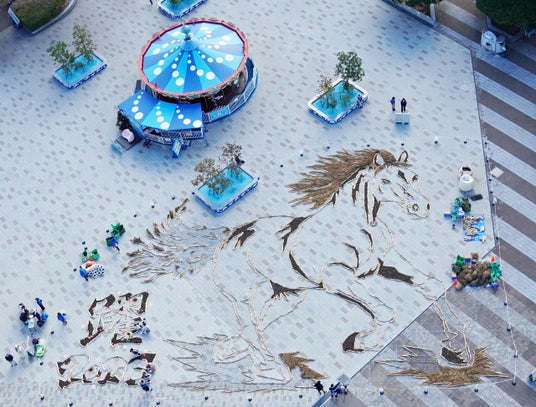 「干支の巨大地上絵」は、冬の新たな魅力づくりのため2008年度から始まり、今年で17作品目となります。巨大地上絵は、縦:23m×横:34mほどの大きさです。輪郭には薪を配置し、たてがみやしっぽには刈り取り後のコキア約600本、脚には約7,500個の松ぼっくりを敷き詰め、園内で採れた自然素材を材料に、迫力ある馬の姿を表現します。