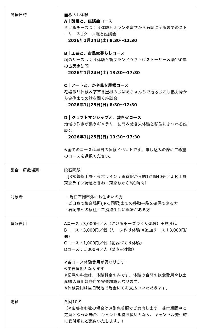 石岡市は、近年の人口減少という課題を抱えています。それに対し、実際に「石岡暮らし」を体感できるような体験型イベントを開催することで、街の魅力を伝え、市や県外の方々に石岡市の魅力を感じてもらい、移住や2拠点居住推進を目指していきます。本イベントでは、石岡市で暮らす方々や先輩移住者達との交流や暮らし体験も可能です。かねてより当社は、茨城の暮らしを体験できる地域体験型メディア、LOCALBOOSTER(https://oarai-coelacanth.com/)を運営しており、石岡に移住等をしてきた体験提供パートナーが複数存在します。本事業においても、パートナーと連携し、暮らし/なりわい体験を通して、双方向のコミュニケーションをとりながら、石岡市の街・人・暮らし方の魅力を体感してもらうことを目的としています。