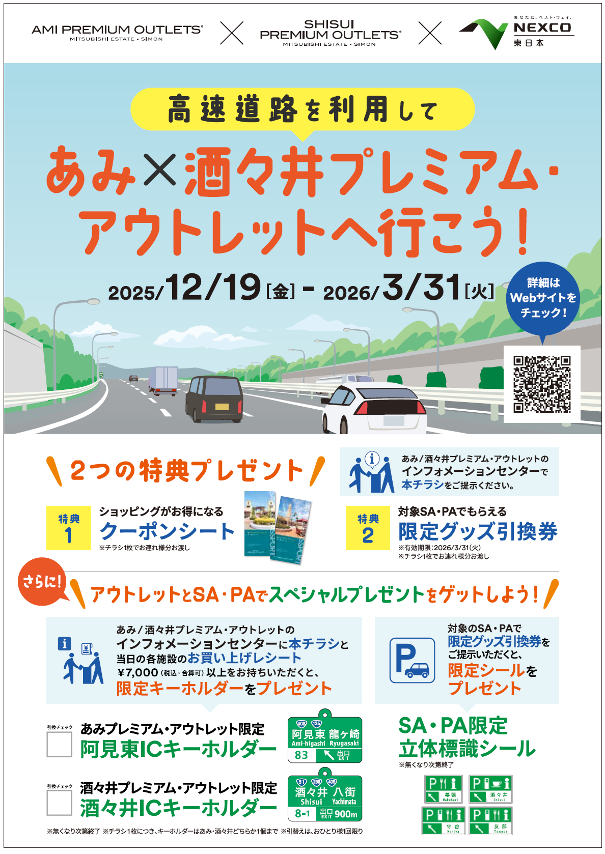 三菱地所・サイモン株式会社が運営するあみプレミアム・アウトレット(茨城県稲敷郡阿見町)および酒々井プレミアム・アウトレット(千葉県印旛郡酒々井町)では、株式会社ネクスコ東日本エリアトラクトと連携し、2025年12月19日(金)~2026年3月31日(火)の期間(※)、アウトレットと高速道路のサービスエリアおよびパーキングエリア(SA・PA)をあわせて利用すると特典が受けられる「高速道路を利用してあみ×酒々井プレミアム・アウトレットへ行こう!」キャンペーンを開催します。