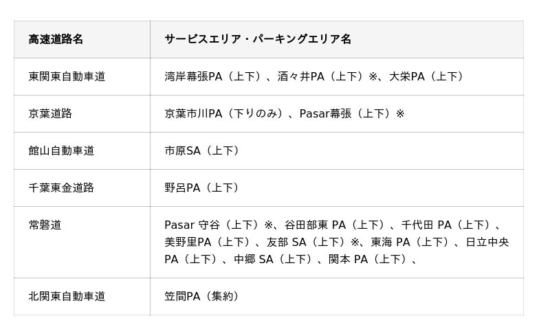 酒々井PA(東関東道)、Pasar幕張(京葉道路)、Pasar守谷、友部SA(常磐道)
