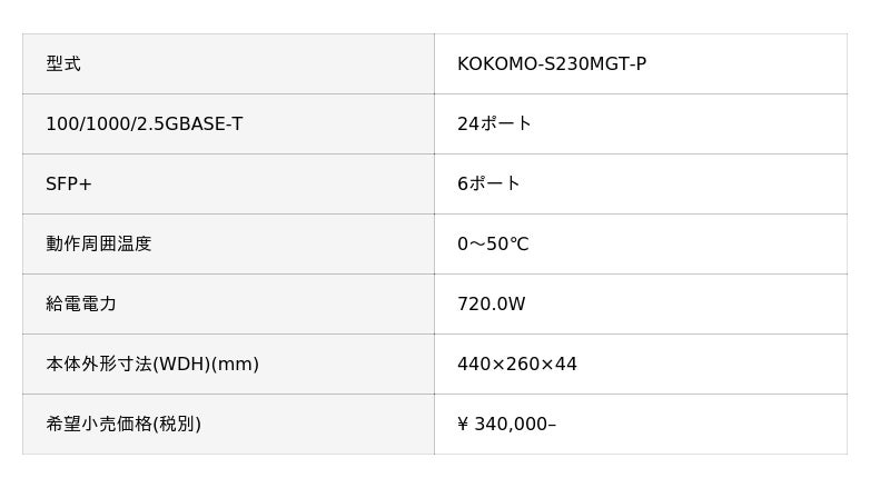 - 100/1000/2.5GBASE-Tが24ポート、SFP/SFP+が6ポートで、240Gbpsのスイッチング容量