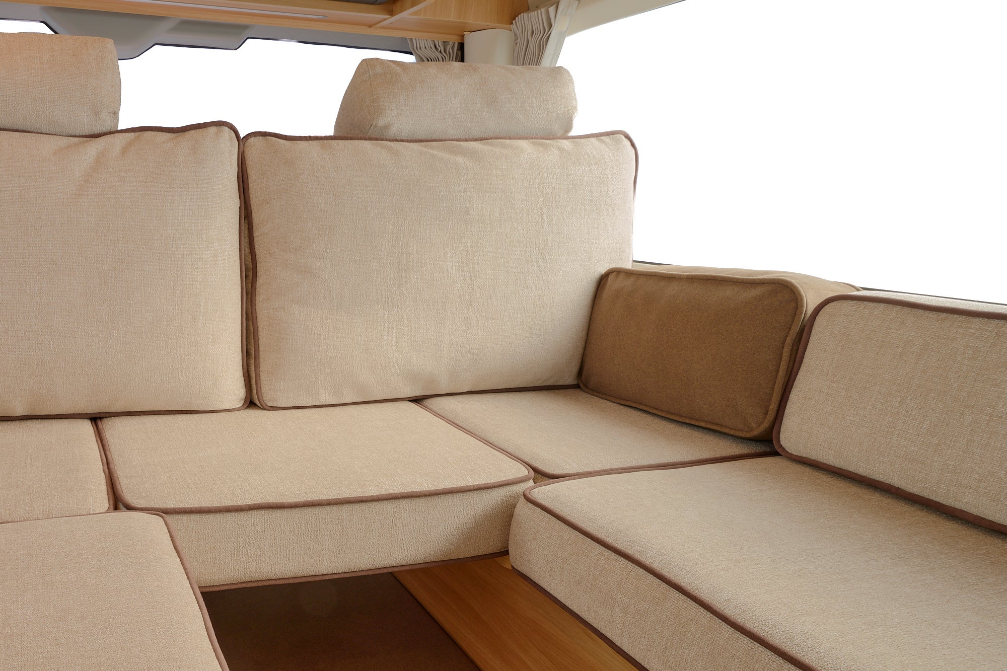 bloccoならではの包み込むようなしなやかな座り心地を、キャンピングカーの室内にそのまま再現。家族でくつろぐ時間も、一人で読書やうたた寝を楽しむ時間も、ソファの存在を忘れるほどの快適さを実現しました。
