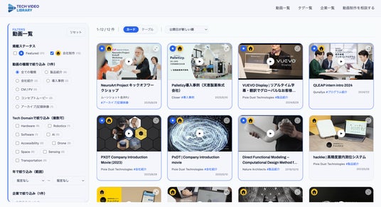 本サービスは、企業名・タグ(動画の種類)・Tech Domain・公開年など複数の軸で絞り込みができ、映像制作のリサーチや企画検討、事例収集を効率化します。
