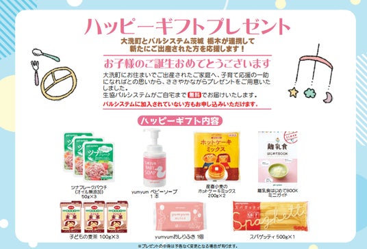 生活協同組合パルシステム茨城 栃木(本部:水戸市梅香、理事長:青木恭代)と大洗町(國井豊町長)は2月2日(月)から、町内で希望された乳児家庭へ提供する「ハッピーギフトプレゼント」の申請受け付けを開始します。大洗町との子育て支援推進における連携合意書に基づき、新生児を迎えた世帯へ育児に活用できる商品の詰め合わせを出生祝いとして届けます。