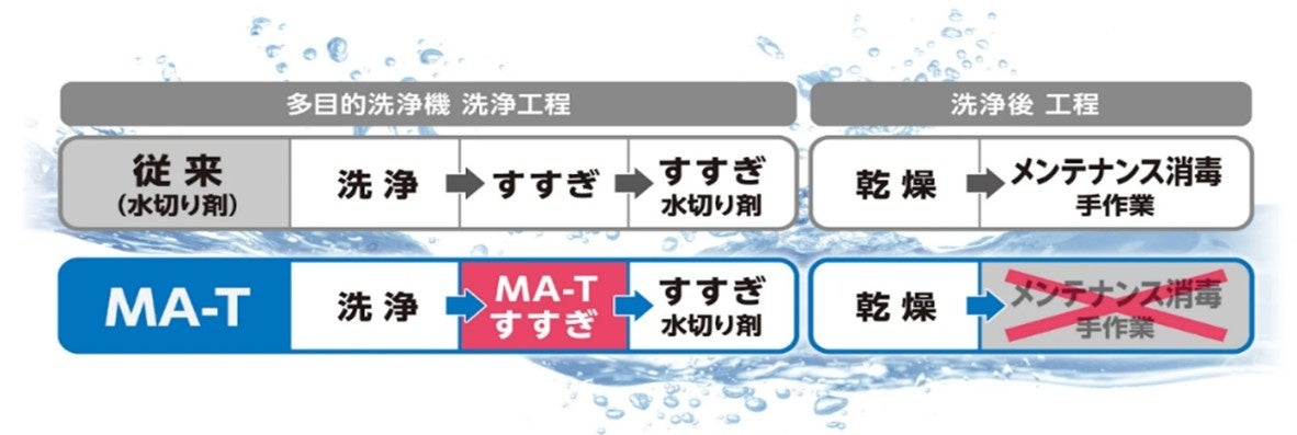 革新的酸化制御技術「MA-T(R)」をすすぎ水として活用。すすぎと消毒を同時に行うことで、従来必須であった「手作業による拭き上げ消毒」を機械による「すすぎ」だけで完結させ、メンテナンスの手間を大幅に削減できることが期待されます。