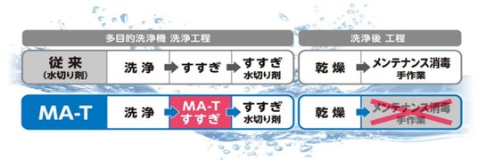 「MA-T(R)」は腐食性が低く機械の金属部への影響も少ないため、洗浄機内部のカビの発生抑制や、介護用品の長期的な品質保持への貢献が期待されています。