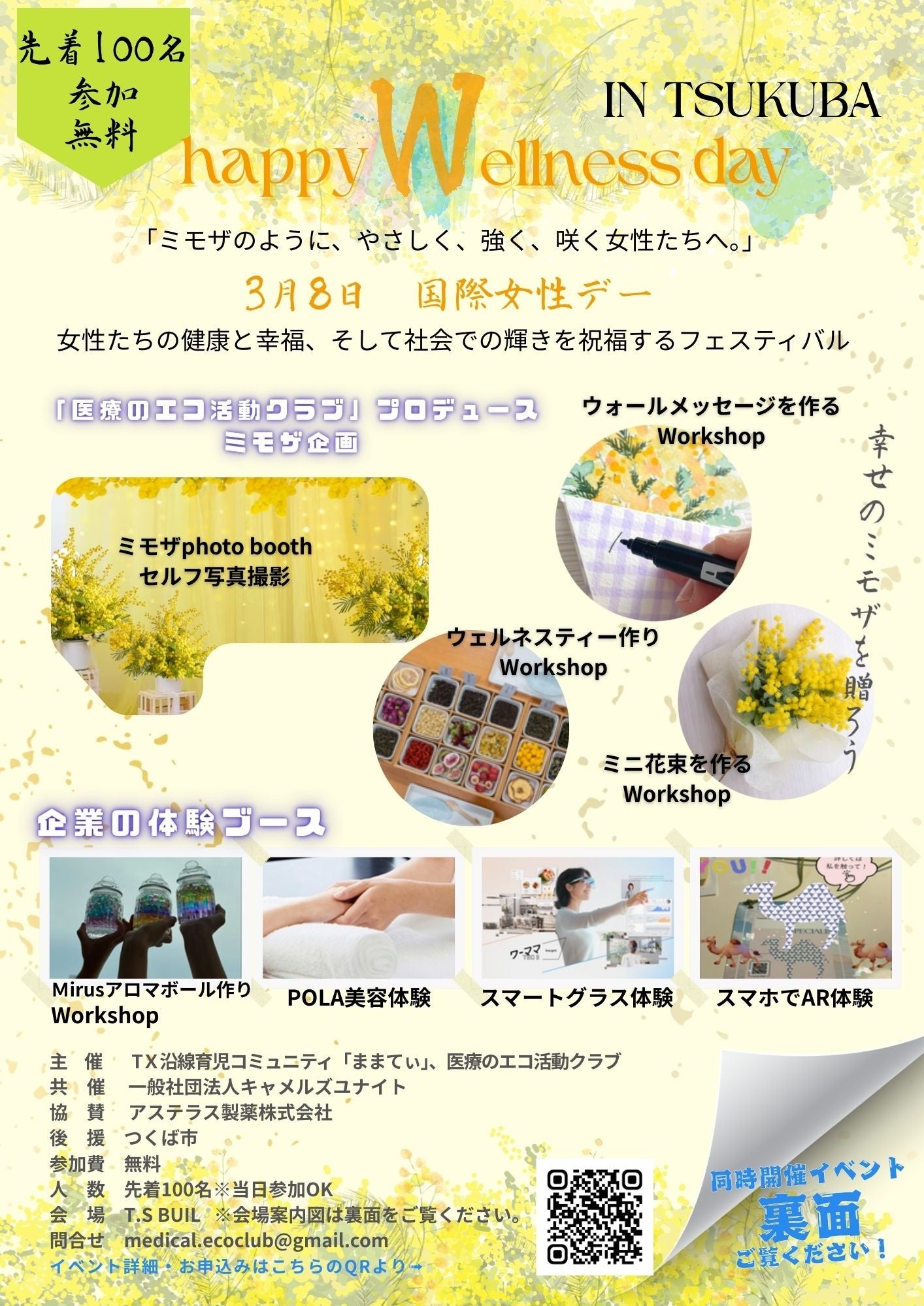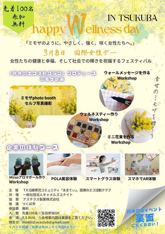 当日同じ会場内で、3月8日の世界女性デーにちなんで女性たちの健康と幸福、そして社会での輝きを祝福するフェスティバル「Happy Welllness Day inつくば!@つくば」を開催します!