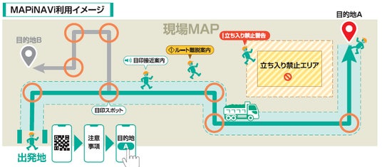本アプリは、建設現場や造成地、山間部、仮設・未供用道路、大規模工場など、一般的な地図データに収録されていないエリアにおいても、図面を重ね合わせたオリジナルマップを活用することで、スムーズなナビゲーションを実現するものです。稼働中の現場で実証実験を行い、市販のナビに対応しない場所でもアプリが適切に動作することを確認しました。