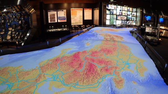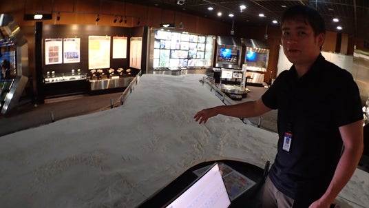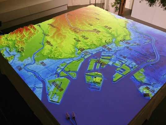 東京のプロジェクションマッピング模型。3メートル四方。東京駅を中心にした30km四方の情報を立体模型上にプロジェクションマッピング。地形や交通網、海面変動による地形の変化、縄文時代や江戸時代の様子などをプロジェクションマッピングできる。NHK・BSプレミアムにて使用。