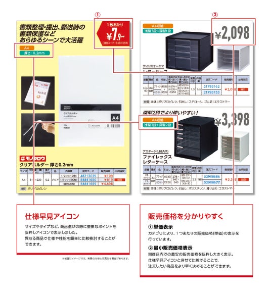 値段を大きく表示して分かりやすくするとともに、「コピー用紙1枚あたりいくらなのか」といった単価レベルで価格を比較できる情報を掲載しています。これにより、当社のプライベートブランド(PB)商品の安さやコストパフォーマンスの高さがひと目で実感でき、経費削減に直結する商品選びをサポートします。