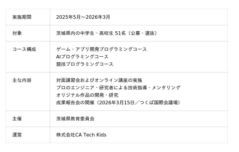 子ども向けプログラミング教育事業の株式会社CA Tech Kids(読み:シーエーテックキッズ、本社:東京都渋谷区、代表取締役社長:上野朝大)は、茨城県教育委員会が主催する「茨城県プログラミング・エキスパート育成事業」において、2025年度の全プログラムが終了したことをお知らせいたします。